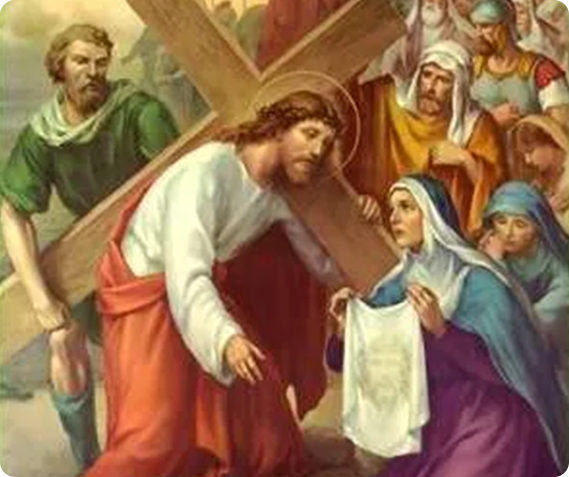 V: We adore You, O Christ, and we praise You. (Genuflect)R: Because, by Your holy cross, You have redeemed the world. (Rise)V: Consider the compassion of the holy woman, Veronica. Seeing Jesus in such distress, His face bathed in sweat and blood, she presented Him with her veil. Jesus wiped His face, and left upon the cloth the image of his sacred countenance. (Kneel)